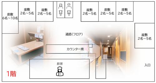 【1층】카운터석, 5분×6방, 10분×1방/1층에는 L자의 카운터석과, 호리리 고타츠 개인실을 총 7방 준비.주위를 신경쓰지 않고 편안하게 보내실 수 있습니다.접대나 기념일등의 특별한 대접으로부터, 친구나 가족과의 식사 등, 다양한 장면에서 부디.