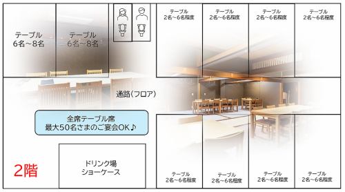【2층】최대 50분 전후/2층은 모두 테이블석에서 준비! 2층을 전세하고, 최대 50분 전후의 연회를 만끽하실 수 있습니다.인원수에 따라 플로어 절반 전세 등, 인원수에 따라 유연하게 대응하므로 상담해 주세요